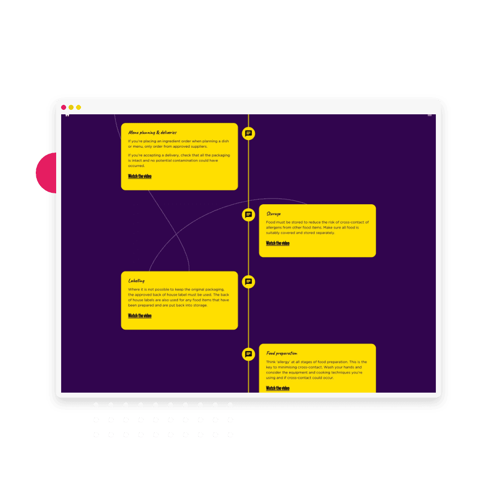 The feeling of positivity is realised through a series of videos that feature throughout the training. One ‘split screen’ style video shows the positive impact of allergen awareness on a colleague navigating their allergy during a meal with friends on their birthday. In another video we hear the value of allergy champions from a customer perspective, and in another we hear the benefits of being an allergy champion from the champions themselves.