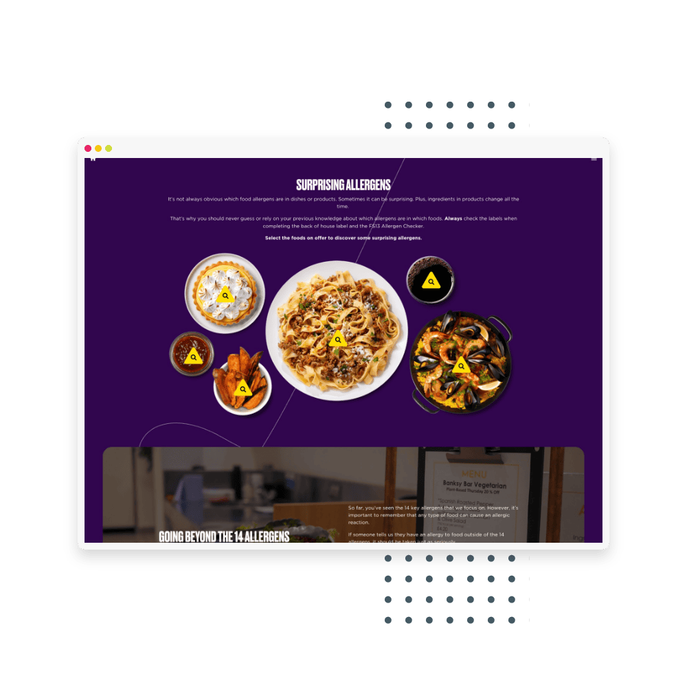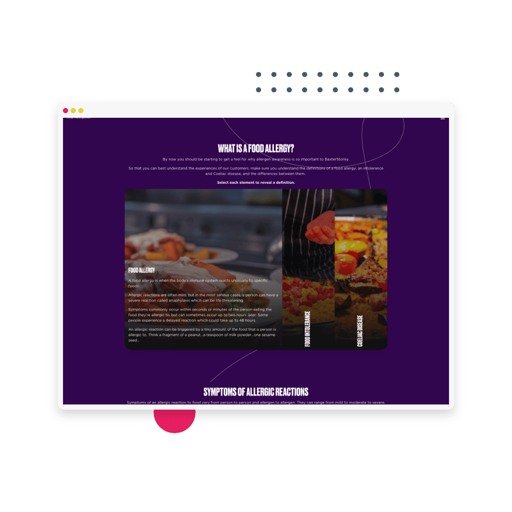 BaxterStorey worked with Mindboost to create two digital learning modules. The first empowers food handlers in carrying out the correct allergen safety procedures at their site. The second is for ‘allergen champions’ who act as allergen experts for both customers and their team at BaxterStorey locations. The digital learning modules feature engaging interactions on modern scolling pages, interactive video, and work across devices.